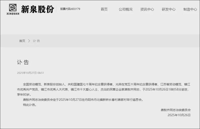 10月27日,新泉股份公告称,公司收到公司创始人、实际控制人之一唐敖齐的家属通知,唐敖齐于2025年10月26日逝世,享年80岁。